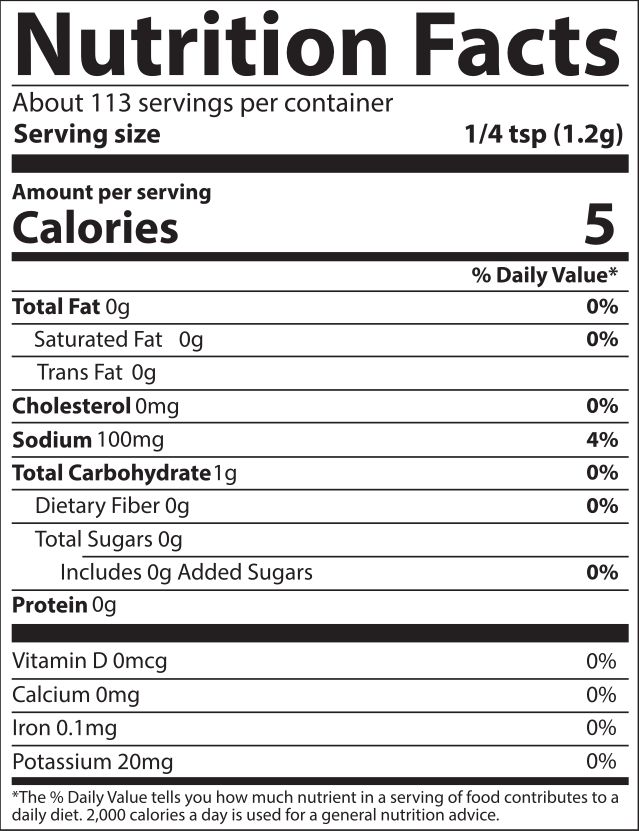 The small serving size of 1/4 tsp (1.2g) is standard for seasoning and spice products. This allows us to provide precise nutritional information per serving and helps consumers use the right amount to achieve the desired flavor without over-seasoning.